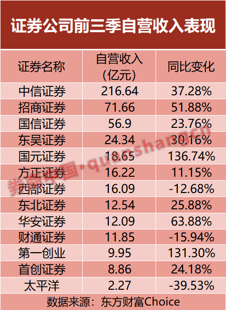 从收入构成来看,自营与资管两大板块成为多数券商业绩增长的亮点。在自营业务方面,截至10月29日,共有10家上市券商的自营收入同比增幅超过两位数,占比达到77%。其中,国元证券与第一创业自营收入同比增幅均超过130%,招商证券前三季度自营收入也同比增长51.88%。