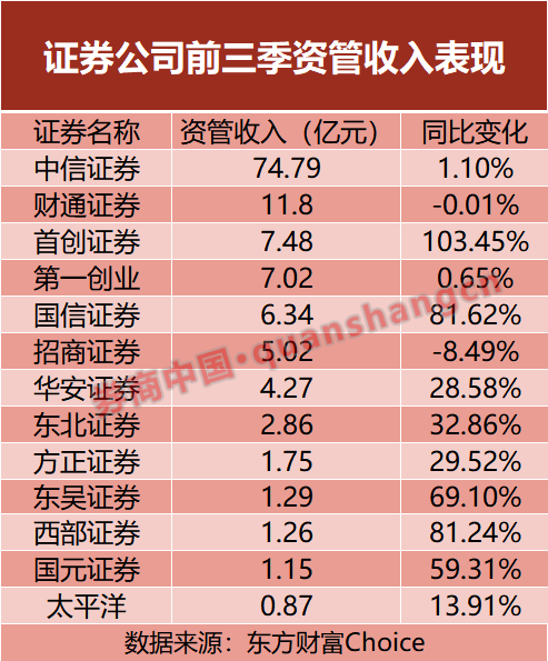 在资管板块,同样有多达9家券商资管收入增幅超过两位数,占比69%。其中,首创证券前三季度资管业务手续费净收入同比大增103.45%,国信证券资管收入也同比增长81.62%。