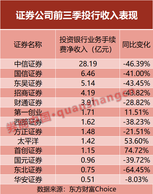 然而,对于经纪与投行两大传统板块,证券公司今年前三季度表现并不理想。随着一级市场政策环境转向以及二级市场的持续震荡,券商的经纪业务与投行业务面临严峻挑战。截至10月29日晚,13家上市券商今年前三季度经纪业务手续费净收入全线下滑,但降幅相对有限。相比之下,投行收入下滑幅度更大,有7家证券公司的投资银行业务手续费净收入同比下滑超过30%。其中,中信证券、国信证券、招商证券等大型券商投行收入同比减少均超过40%。