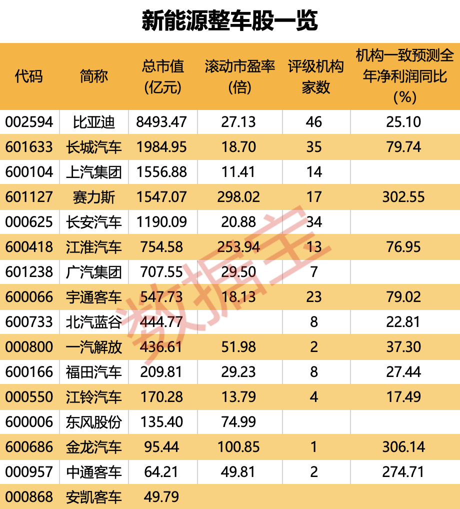 根据机构预测,金龙汽车、赛力斯和中通客车今年净利润有望翻倍,而长城汽车、宇通客车和江淮汽车全年净利润增速均在70%以上。新能源整车板块估值为28.02倍,比亚迪、长安汽车、长城汽车、宇通客车、江铃汽车和上汽集团等个股估值较低。