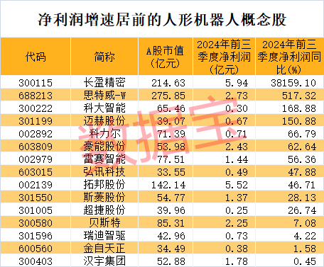 据证券时报·数据宝统计,从已公布的三季报数据来看,今年前三季度,15只人形机器人概念股净利润实现同比增长(含扭亏为盈),其中长盈精密、思特威-W、科大智能、迈赫股份净利润翻倍增长。增速靠前的还有科力尔、豪能股份、雷赛智能等。
