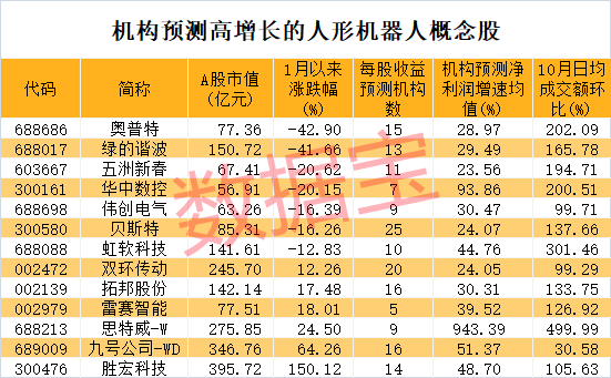 未来增长潜力方面,据数据宝统计,根据5家以上机构一致预测,2024年—2026年净利润增速均有望超20%的人形机器人概念股有13只。其中,今年以来有7股跌幅超10%,包括奥普特等。10月以来,A股成交活跃度大幅提升,上述13只概念股也明显放量,日均成交额环比翻倍的有10只。
