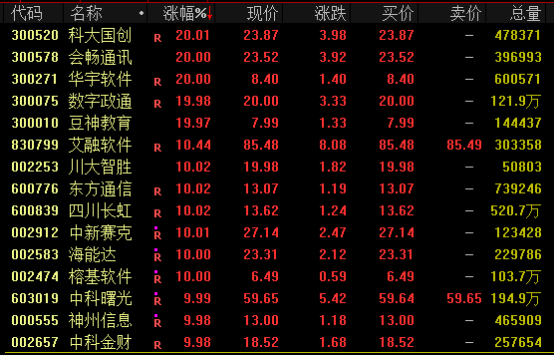 TMT板块午后集体拉升,信创、云计算、信息安全等板块均有所表现。截至收盘,科大国创、会畅通讯、华宇软件、数字政通等个股20%涨停,艾融软件涨幅超过10%,海能达、中科曙光、中国长城等个股也封上涨停板,常山北明涨幅超过8%,盘中一度涨停。