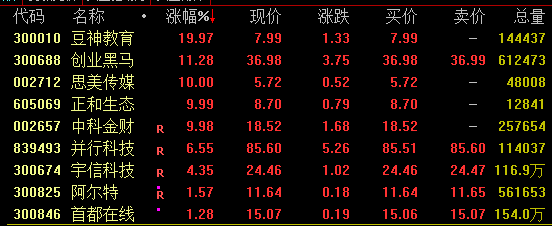 智谱AI概念盘中大幅拉升,截至收盘,豆神教育20%涨停,斩获两连板,创业黑马涨幅超过11%,思美传媒、正和生态、中科金财也涨停;并行科技涨幅超过6%,盘中一度大涨近26%,突破100元大关,再创新高。