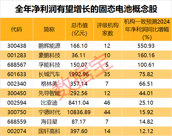 从主力资金净流入额来看,天奈科技、珈伟新能、江苏国泰等概念股的主力资金净流入额居前。而从机构评级来看,鹏辉能源、豪鹏科技、孚能科技、长城汽车等10股今年全年净利润有望实现同比超10%的增长。