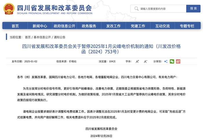 四川省发改委发布通知,暂停2025年1月大工业用户尖峰电价政策,以优化电力资源配置,引导用户调整用电高峰与低谷,平衡电力供需矛盾。