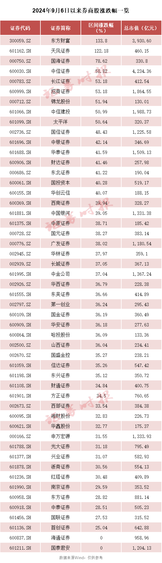 具体券商股方面,东方财富、天风证券等券商股在此期间累计涨幅均超过100%,国海证券、中信证券、长江证券、招商证券、锦龙股份、中信建投、太平洋等券商股也均实现了50%以上的涨幅。