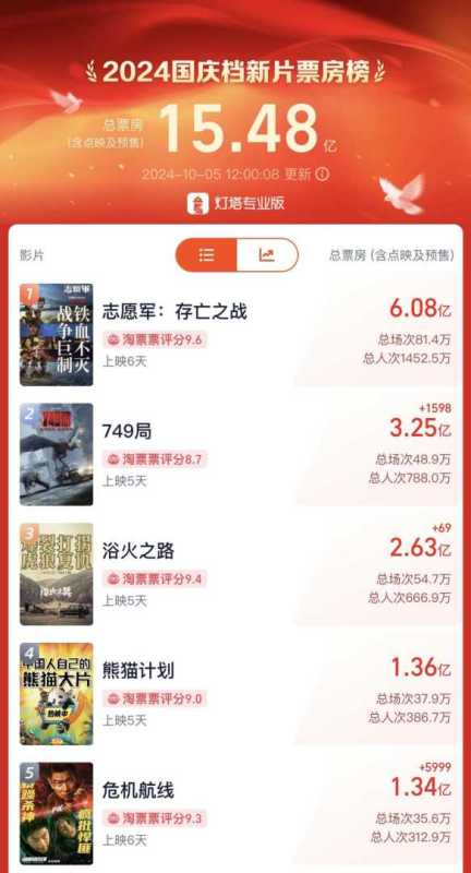 据网络平台数据显示,截至发稿时,2024年国庆档档期票房已突破15亿大关,其中《志愿军:存亡之战》、《749局》以及《浴火之路》三部影片以卓越表现暂居国庆档票房榜前三甲。