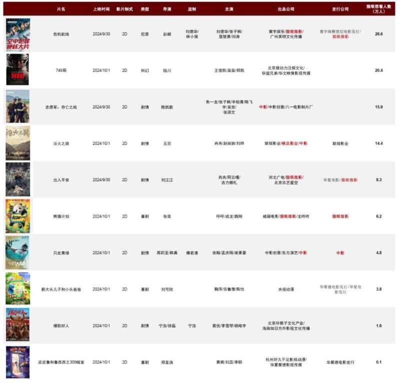 今年国庆档热闹非凡,共有10部新片登陆大银幕,包括《志愿军:存亡之战》、《749局》、《浴火之路》、《危机航线》及《熊猫计划》等。在这之中,8部真人影片均为中大制作,堪称近几年国庆档头部及中腰部新片数量之最,影片类型也极为丰富,涵盖了科幻、战争、犯罪、动作、喜剧、灾难、剧情、动画、歌舞等多种题材。
