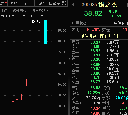 作为本轮行情的绝对领头羊,互联网金融板块涌现出众多牛股,如银之杰、安硕信息、赢时胜等。然而,今天早盘这些股票却集体遭遇重挫,上述三只个股一度全部触及20cm跌停。值得注意的是,这些个股闪崩的速度惊人一致,均在短短1分钟内跳水跌停。其中,银之杰高开后跳水,1分钟内跌幅超24%,一度被封死跌停;而后两只股票则是低开跳水。