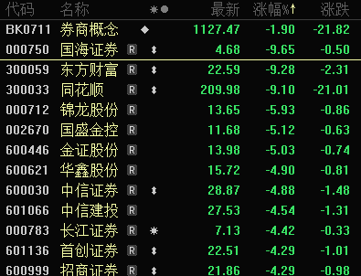 券商股龙头东方财富昨日创造历史,成为史上单日成交额最高的个股,但今日也遭遇重挫,盘中一度触及跌停。此外,国海证券、锦龙股份、国盛金控等众多个股跌幅超过5%。