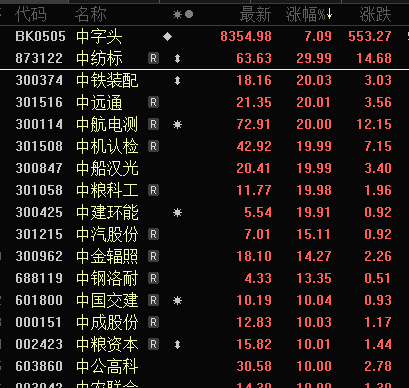中字头股票也集体飙升,中铁装配、中粮科工、中建环能等20cm涨停,中国交建、中成股份、中铝国际等众多个股涨停。