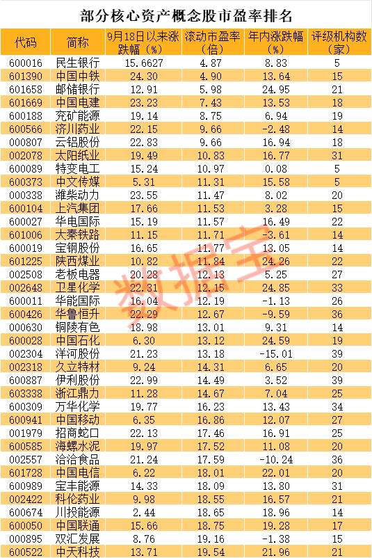 数据宝梳理出本轮涨幅较低、年内涨幅均低于25%且市盈率低于20倍的核心资产股票,合计共有38只。其中,民生银行、中国中铁、邮储银行、中国电建等多只个股市盈率低于10倍。另外,中国中铁、中国电建等个股上午涨停。