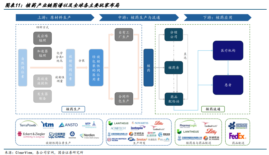 核药的大单品潜力正逐步显现。以诺华制药的前列腺癌核药Pluvicto为例,该药自2022年3月获得FDA批准后,上市两年销售额已接近10亿美元(据诺华财报,2023年和2024年上半年,该药全球销售额分别为9.8亿和5亿美元)。此外,核药的放射性等因素导致上游原料稀缺,中游研发制造企业及下游物流与药店等布局者相对较少,产业高壁垒造就了良好的竞争格局。赵海春等人认为,国内核药产业链的上、中、下游企业均处于发展初期,先发优势显著,是前瞻布局的良好时机,建议投资者关注国内具备核药产业链一体化优势的稀缺标的。