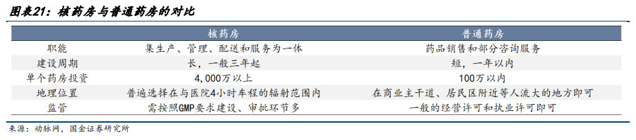 下游方面,受制于核素半衰期及运输安全等因素,核药的快速递送至关重要。核药分销需严格考虑运输距离及上下游产业配套,核药房成为核药企业的重要核心资产。据动脉网数据显示,我国核药房资源主要集中在中国同辐和东诚药业两家公司,其中东诚药业已建设超过30家核药房,基本满足国内94%患者的核医学需求。相较于普通药房,核药房的建设周期和投入资金分别是后者的3倍和40倍左右,且核药房占位效应显著,单个核药房辐射范围约为150-200公里,即4小时车程内,因此,先行布局者具有显著先发优势,对后来者形成较大壁垒。