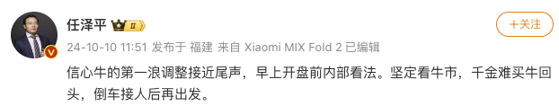 10月10日,知名经济学家、泽平宏观创始人任泽平在其个人微博上发布了一条引人瞩目的观点。他明确表示,“信心牛的第一浪调整已接近尾声,这是早上开盘前我们内部的看法。我坚定地看好牛市,正所谓千金难买牛回头,这就像是一次倒车接人的机会,之后我们便会再次出发,继续前行在牛市的道路上。”