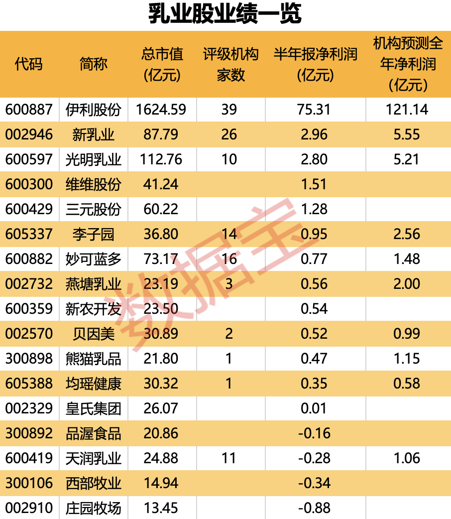 证券时报·数据宝对乳业板块个股上半年的净利润情况进行了梳理,并与3家及以上机构预测的全年净利润进行了对比。