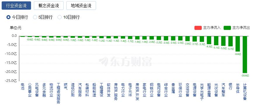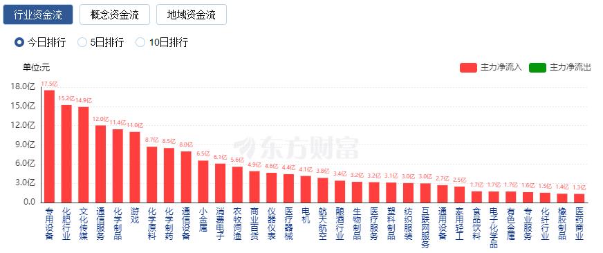 从资金流向来看,专用设备、化肥行业、文化传媒等行业资金净流入排名靠前,其中专用设备净流入高达17.51亿元。而计算机设备、半导体、银行等行业则呈现资金净流出态势,其中计算机设备净流出超过20亿元。