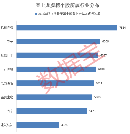 龙虎榜由沪深北交易所依据规则,统计发布日或三日内涨跌幅偏离值大或成交异常个股的前五名买卖席位数据。截至11月19日,2015年以来,沪深北交易所共发布12.07万条龙虎榜数据,其中六类数据占比75.88%。从行业分布看,机械设备、电子、基础化工、计算机等科技行业个股上榜次数多,超5000条。相比之下,金融周期类行业上榜较少。