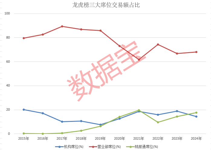 龙虎榜机构席位交易额下降21.44%,占比14.45%,创2021年以来新低。而陆股通席位参与力度增强,2024年累计成交4356.59亿元,占比17.62%,较上年提升3.17个百分点。