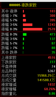 从个股表现来看,市场呈现普涨格局,共有4516只个股上涨,其中103只个股涨停,而下跌的个股仅有777只。