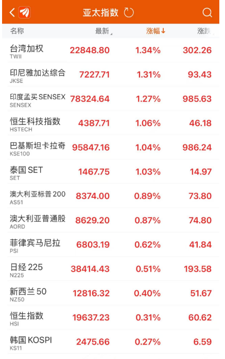 而在亚太市场方面,整体呈现出集体大涨的态势。澳洲标普200指数盘中一度触及8446.4点,创下历史新高,虽然截至发稿时涨幅有所回落,但仍保持在0.89%的较高水平。同时,印度股市也在持续上涨,涨幅约1.3%,为全球股市增添了一抹亮色。