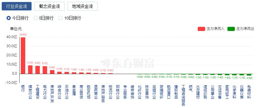 行业资金流向方面,银行、煤炭行业、工程机械等净流入排名靠前,其中银行净流入达39.77亿元。而软件开发、互联网服务、半导体等净流出排名靠前,软件开发净流出更是高达106.6亿元。