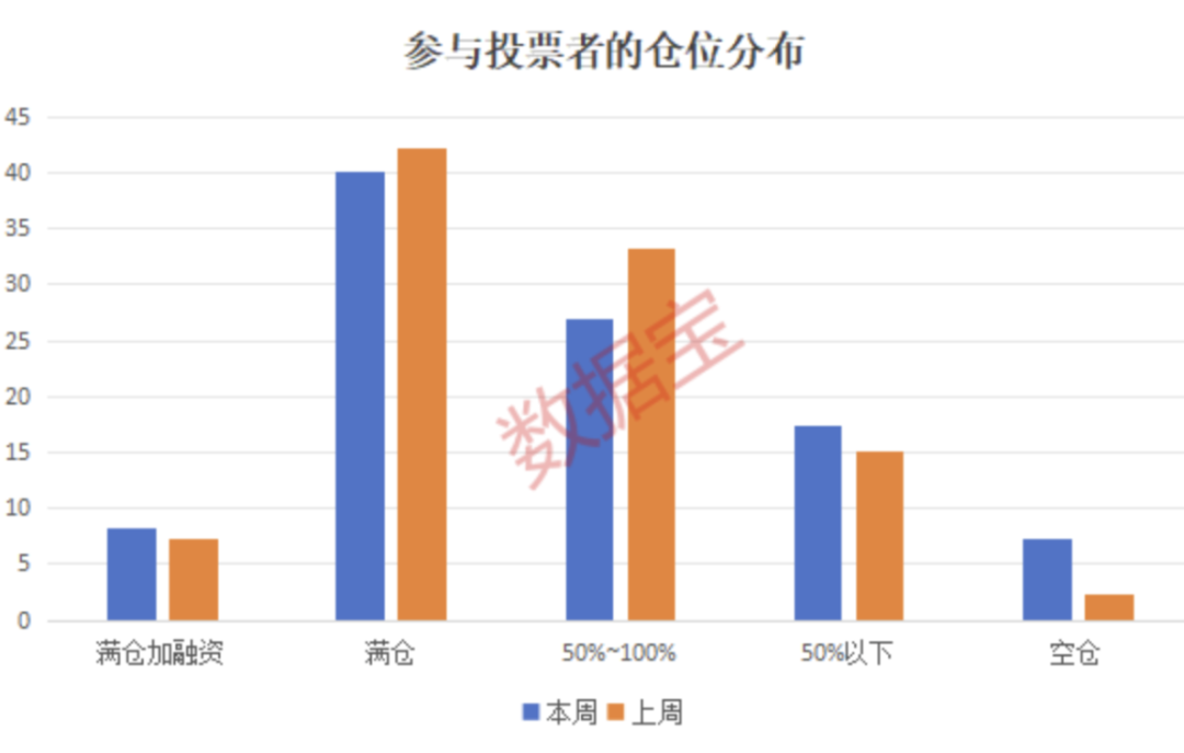 11月16日,数据宝推出了一份《调查,牛市结束了吗?》的小调查,共有近4800位读者参与。调查结果显示,大盘经过上周下跌后,仅29%的受访者认为本周市场将上涨,较前一周的44.41%大幅下降。认为市场将继续区间震荡的受访者占比保持在38%以上,认为冲高回落的受访者比例上升至15.17%,而表示无法判断的受访者占比则大幅上升至17.55%。在仓位变化上,上周加仓的投资者比例在减少,减仓的比例在增加。满仓和满仓加融资的受访者合计占比48.27%,较上一期有所下降;持仓50%~100%的比例也较上期有所减少。在盈利情况方面,仅20%的受访者表示本周挣到了钱,亏损10%以内的受访者占比高达近40%,亏损10%~20%的投资者占比22.15%,而亏损在20%以上的高达近18%。对于接下来的A股走势,受访者中近五成认为牛市尚在,而认为牛市结束了和说不清的观点各占25%。