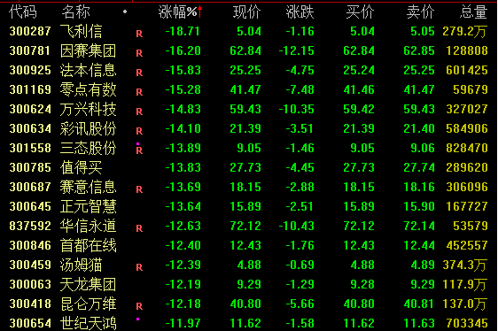近期强势的AI应用概念股今日大幅下挫,截至收盘,因赛集团、法本信息跌幅接近16%,零点有数、万兴科技跌幅接近15%,值得买、汤姆猫、昆仑万维、当虹科技、云从科技等跌幅超过10%,科大讯飞跌幅接近9%。