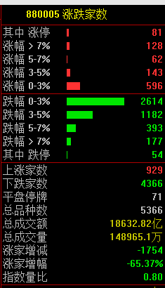 市场走势分化明显,共有929只个股上涨,其中81只个股涨停;而下跌个股则高达4366只,市场氛围较为悲观。