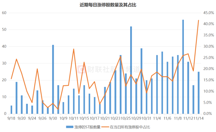 今日(11月14日),ST板块活跃度显著增强,市场数据显示,截至收盘共有25只ST股强势涨停,占据了所有涨停股的41.7%,这一比例在此轮自9月18日以来的反弹行情中创下了新高。其中,*ST鹏博与大千生态均实现了8连板的佳绩,并列成为当前市场的最高连板股。