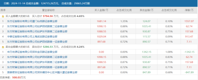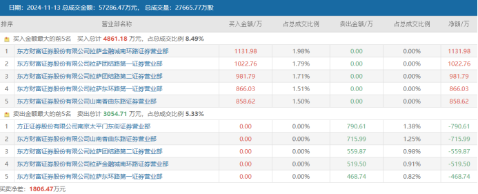 值得注意的是,在这25只涨停的ST股中,有12只股票呈现连板状态,晋级率接近50%。其中,*ST鹏博凭借8个连续涨停,成为市场关注的焦点之一。*ST鹏博(鹏博士)主营数据中心及云计算、互联网接入等业务,其股价的强势表现吸引了大量资金的关注,尤其是“拉萨天团”的资金。从*ST鹏博最近一次(11月13日)的龙虎榜数据来看,买卖前五席位中,有近半席位属于东方财富证券拉萨团结路和拉萨东环路。