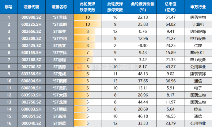 按申万一级行业分类,今日涨停的25只ST股中,医药生物板块表现尤为突出,涨停股数量占比接近五分之一。此外,电子、建筑装饰、综合、房地产、通信等行业也占据了相当比例,传媒、纺织服饰、公用事业、计算机、汽车、轻工制造、商贸零售等板块同样有ST股涨停。从市值角度看,*ST金科、ST九芝、*ST花王、ST百灵、*ST景峰等6只ST股市值规模较大,均在50亿元以上。
