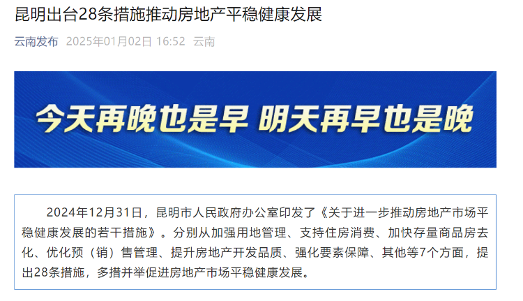 据云南发布消息,2024年12月31日,昆明市人民政府办公室正式颁布了旨在进一步促进房地产市场平稳健康发展的多项新举措,这些举措被汇总在《关于进一步推动房地产市场平稳健康发展的若干措施》文件中。文件中明确指出,将优化商品住房的预(销)售方案管理,并鼓励房地产企业根据自身情况,选择按套内面积或按套的方式进行商品住房销售。