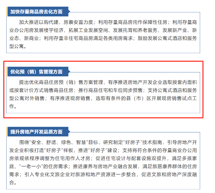 该政策在优化预(销)售管理方面,提出了多项具体举措,除了上述提到的销售方式选择外,还包括推行商品住宅和车位同步预售,支持公寓式酒店和服务型公寓对外销售,以及选取有条件的县(市)区作为现房销售的试点。