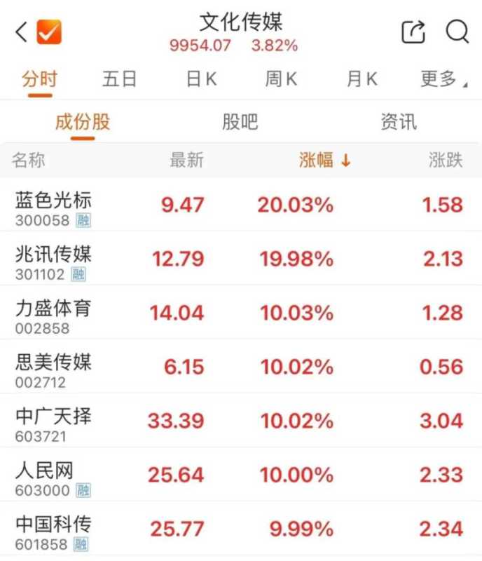 传媒板块也在午后迎来拉升行情,蓝色光标、兆讯传媒、思美传媒等多只个股涨停,显示出传媒行业的强劲反弹势头。