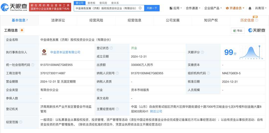 中金绿色发展(济南)合伙企业成立,注册资本33亿