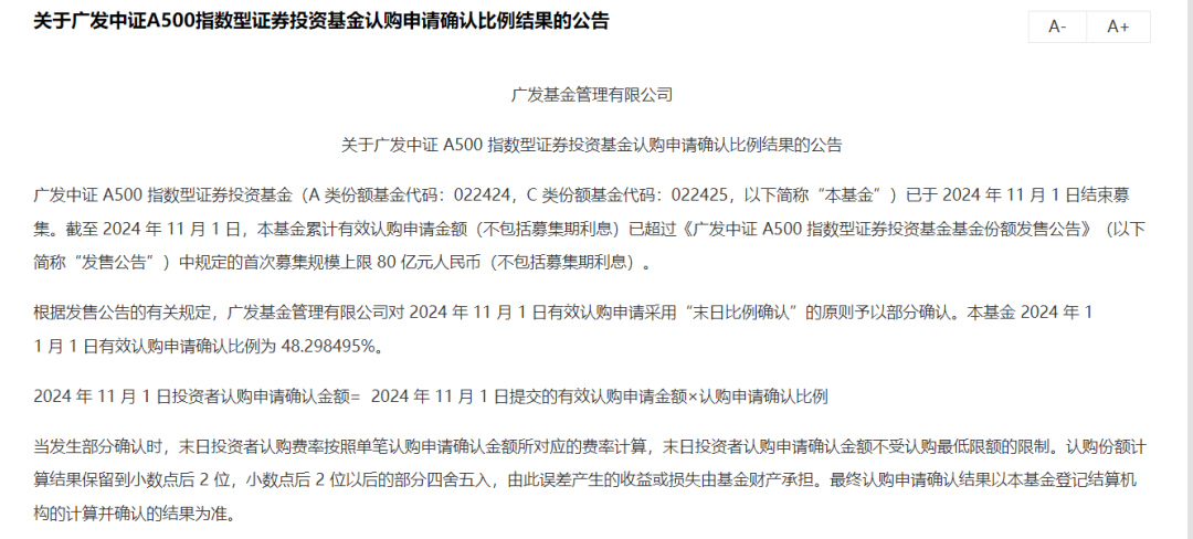 除了中证A500ETF外,中证A500场外指数基金的发行也频频出现爆款。例如,泰康中证A500ETF联接一日之内便结束了募集,认购资金超过52亿元;而广发中证A500指数基金的认购资金更是超过了80亿元,对有效认购申请采用了“末日比例确认”的原则进行部分确认。