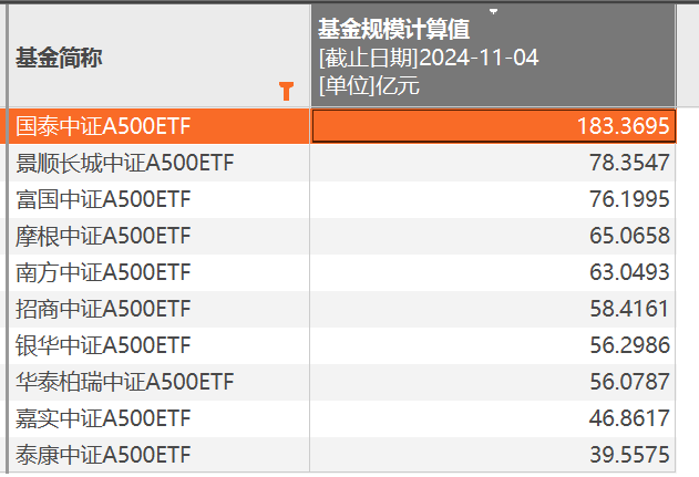 此外,已经上市的首批10只中证A500ETF的规模也在持续增长。据测算,截至11月4日,这10只ETF的总规模已经从200亿元增至723.25亿元。其中,国泰中证A500ETF的规模达到了183.37亿元,景顺长城中证A500ETF的规模为78.35亿元。