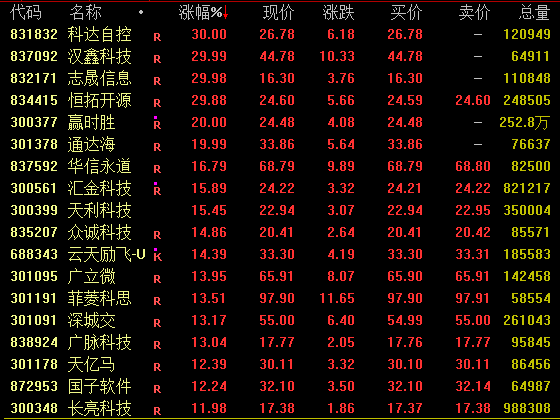 北证A股市场同样表现亮眼,科达自控、旺成科技、朱老六等15只股票30%涨停,其中朱老六连续3日涨停。此外,金融IT概念也集体爆发,同花顺涨幅超过19%,财富趋势涨幅超过11%,指南针涨幅接近10%,大智慧涨幅超过8%。