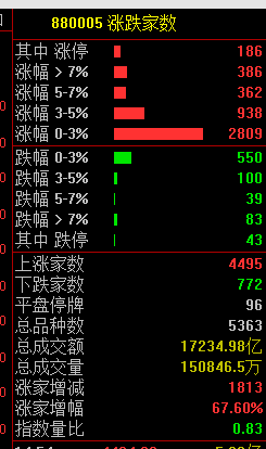 当日,两市共有4495只个股实现上涨,其中186只个股强势涨停,展现出市场的强劲动力。相比之下,仅有772只个股下跌,市场分化格局有所缓解。