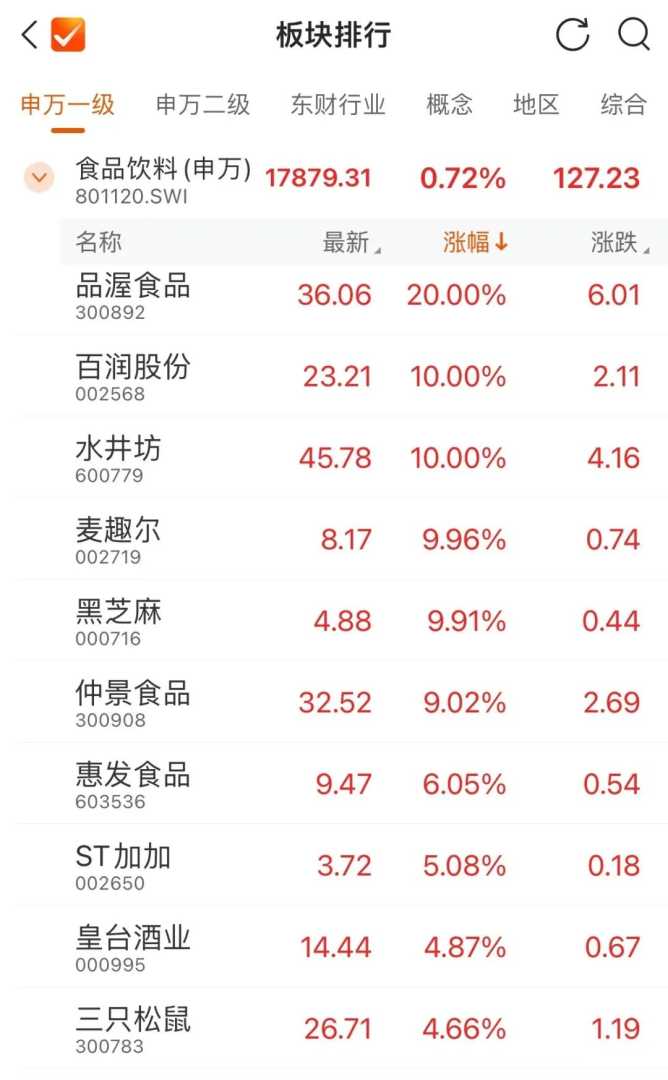 午后,大消费板块持续拉升,食品饮料方向表现尤为突出。截至收盘,品渥食品、百润股份、麦趣尔、黑芝麻等个股纷纷涨停。