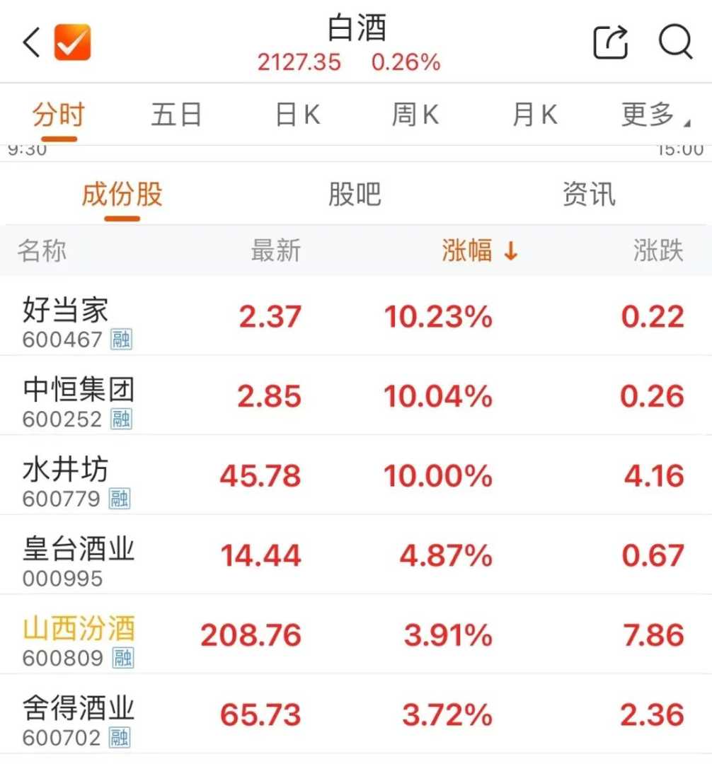 在白酒股方面,今日同样展开反攻。截至收盘,好当家、水井坊等个股涨停,而皇台酒业、山西汾酒、舍得酒业等个股也涨幅居前。