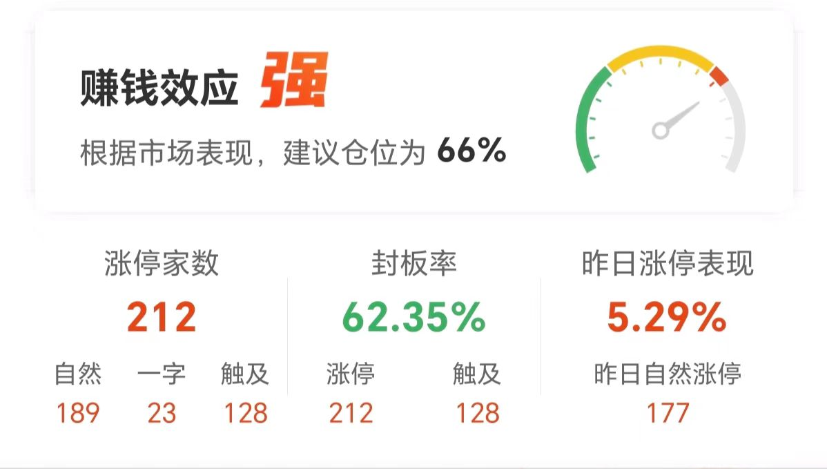 涨停个股数量方面,市场活跃度较高。截至收盘,今日共有212只个股涨停,另有128只个股盘中一度触及涨停,封板率达到62.35%。然而,也需注意到,部分高位股在尾盘出现炸板情况,但其中部分个股最终仍成功回封。