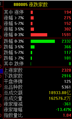 今天市场三大指数盘中跳水,沪指、深成指午后跌超1%,创业板指一度跌逾2%,尾盘跌幅有所收窄。截至收盘,沪指收跌0.61%,深成指收跌0.12%,创业板指收跌1.18%。市场呈现分化行情,共2320只个股上涨,194只个股涨停,而2916只个股下跌。
