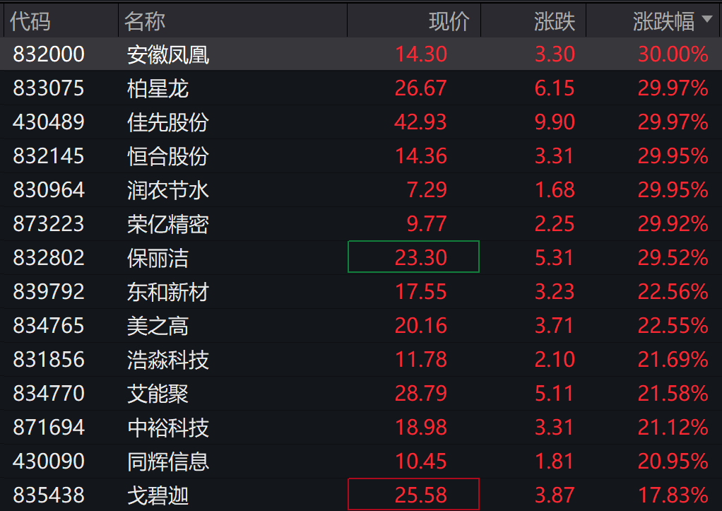 今日早盘,北证50指数持续领跑,涨幅超过4%。柏星龙、佳先股份、恒合股份、润农节水等多只股票涨停,东和新材、浩淼科技、艾能聚等涨幅超过20%。