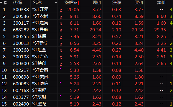 ST板块同样是低价股集中的领域,今日再度大涨3.3%,连续第7日高开高走,创下近半年来新高。其中,*ST开元20%涨停,3日内2次涨停;ST加加连续6日一字涨停;*ST同洲连续3日涨停,近15个交易日更是13次涨停。全市场合计有47只ST股涨停。