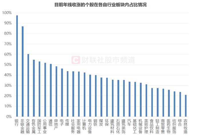 注:截至10月25日收盘,年线收涨个股在各自行业板块内占比情况