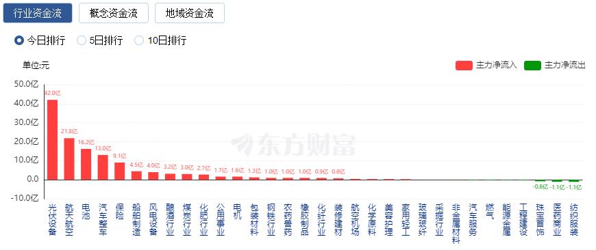 行业资金流向方面,光伏设备、航天航空、电池等板块资金净流入靠前,其中光伏设备净流入高达42.03亿元。而半导体、软件开发、文化传媒等板块则资金净流出较多,半导体板块净流出高达87.92亿元。