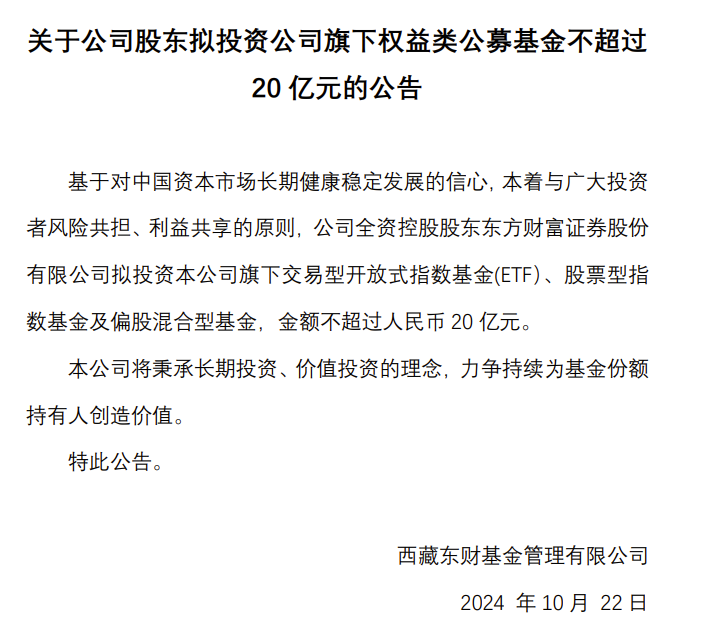 西藏东财基金公告截图,宣布重磅自购计划。